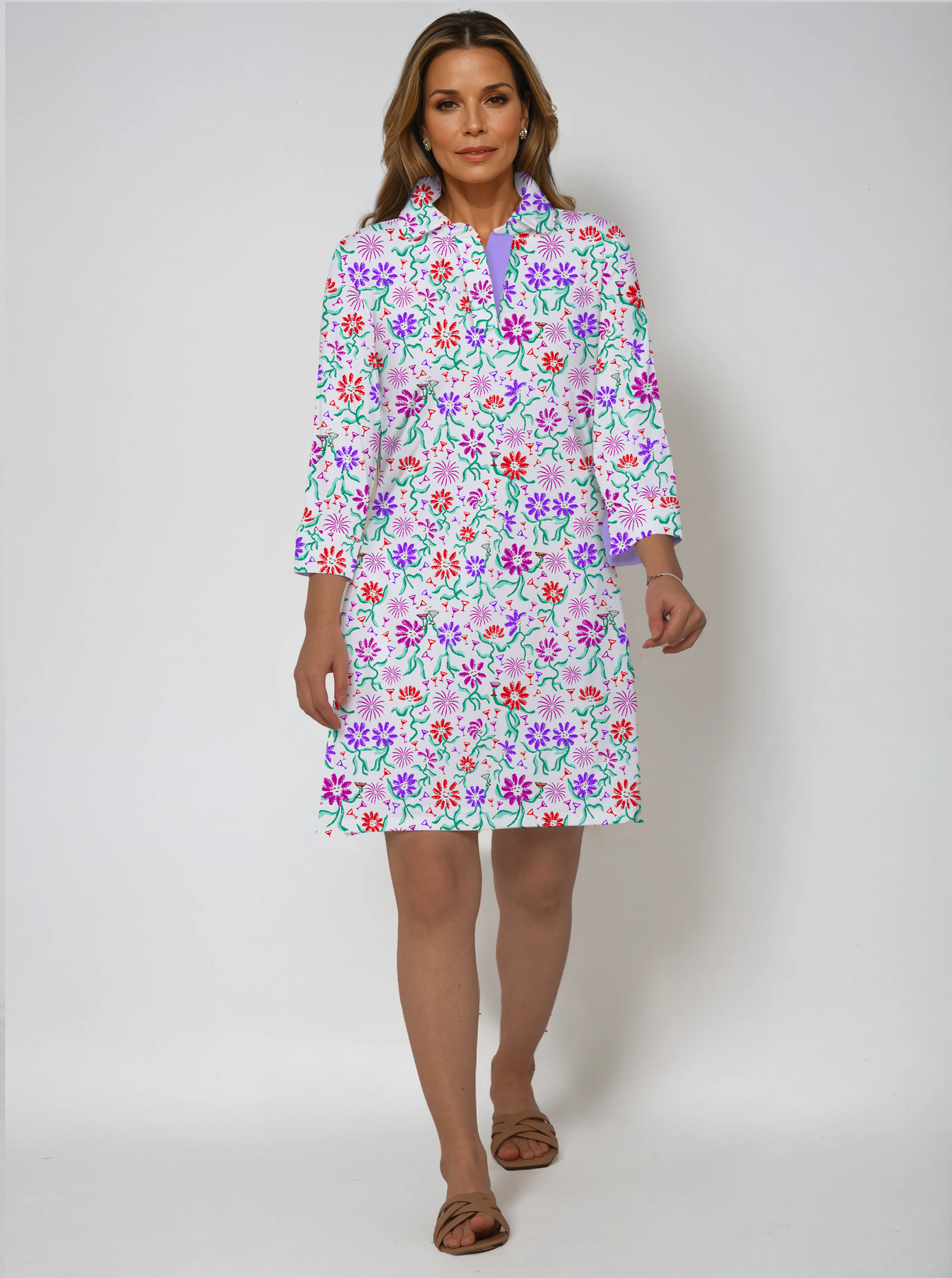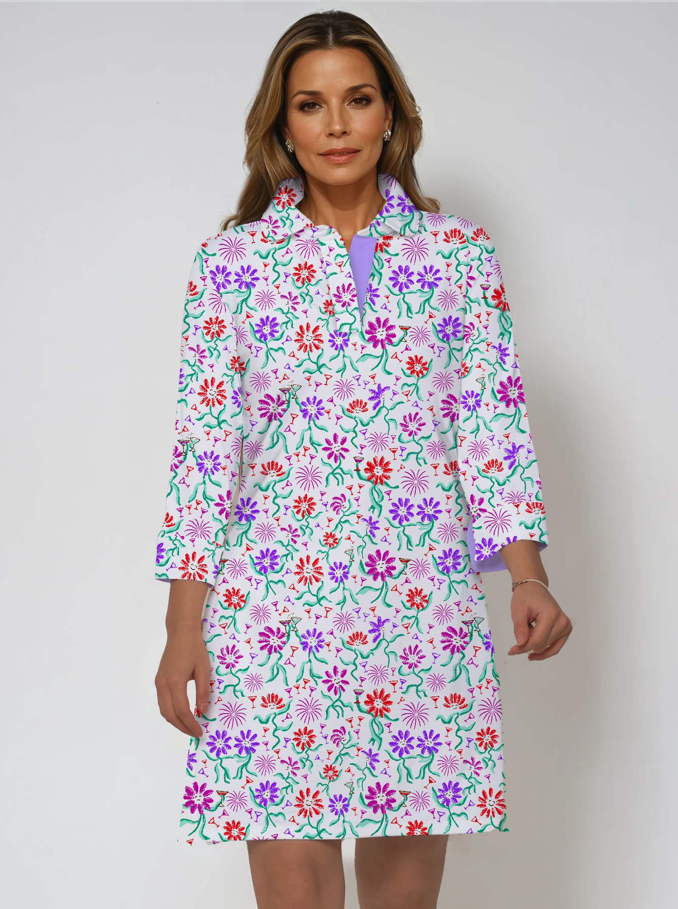 Dancing Daisy Print Cotton Knit 3/4 Sleeve Polo Neck Dress (Regular Fit)