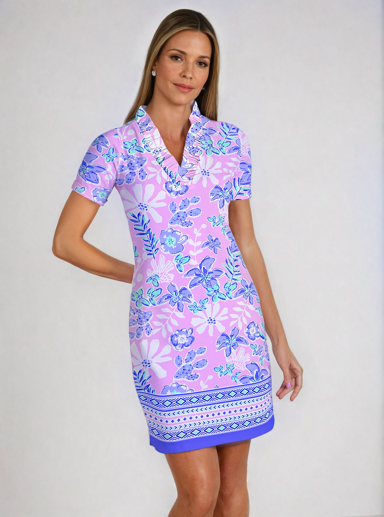 Paradise Island Print Cotton Knit Half Sleeve Ruffle Portrait Neck Dress