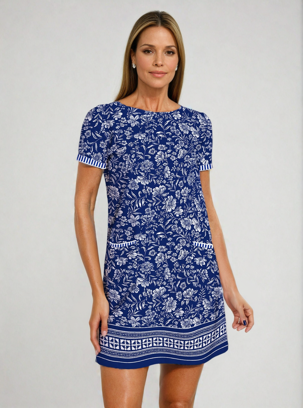 Natalia Print Cotton Knit Short Sleeve Front Piping Pocket Dress