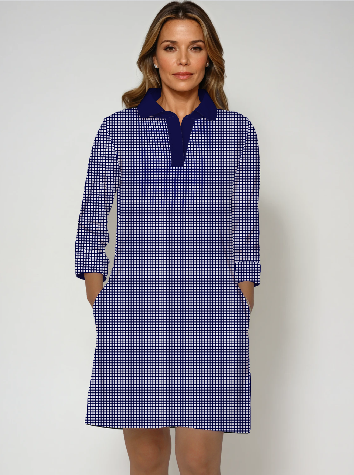 Check Print Cotton Knit 3/4 Sleeve Polo Neck Dress (Regular Fit)