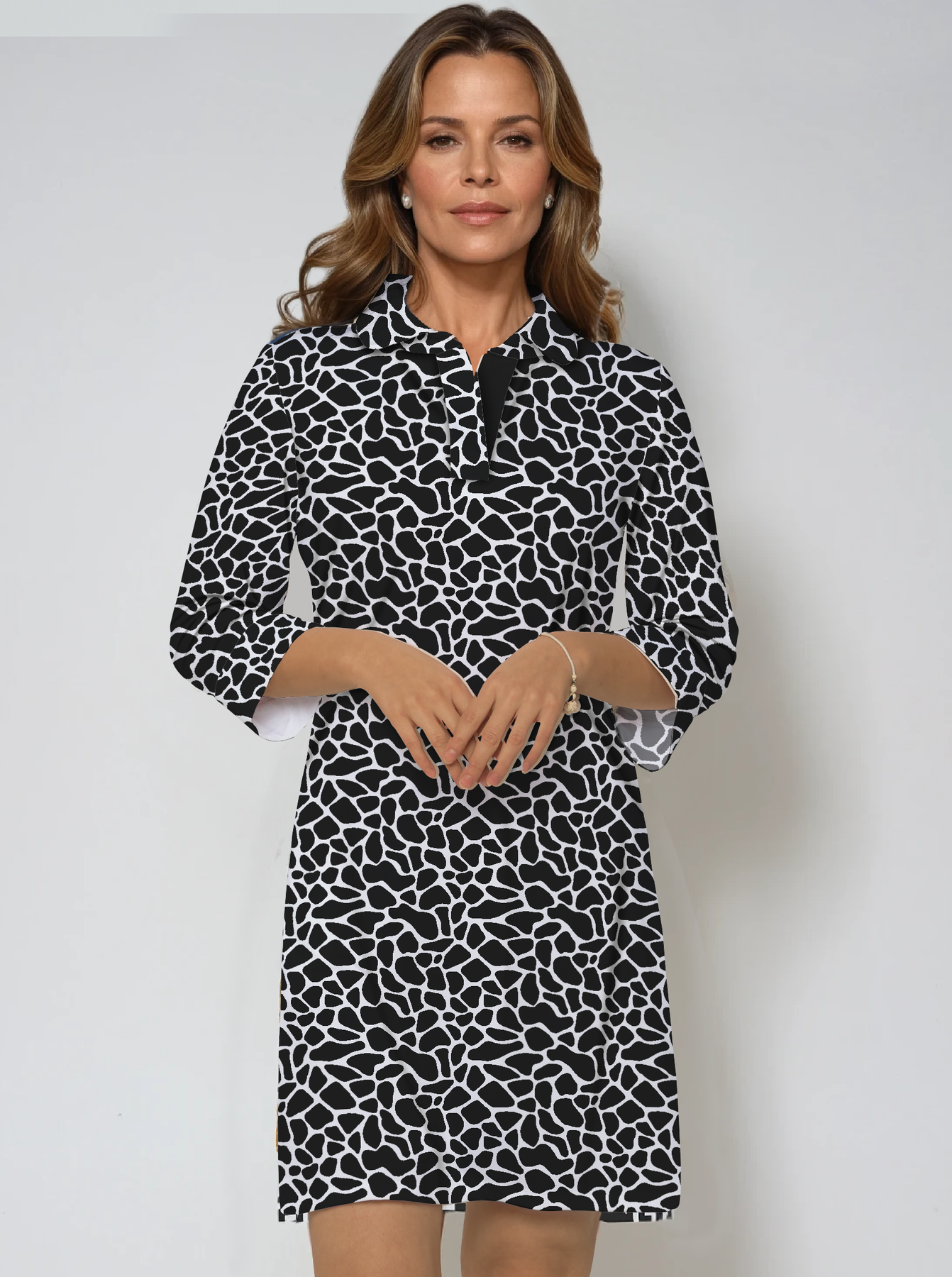 Giraffe Print Cotton Knit 3/4 Sleeve Polo Neck Dress (Regular Fit)