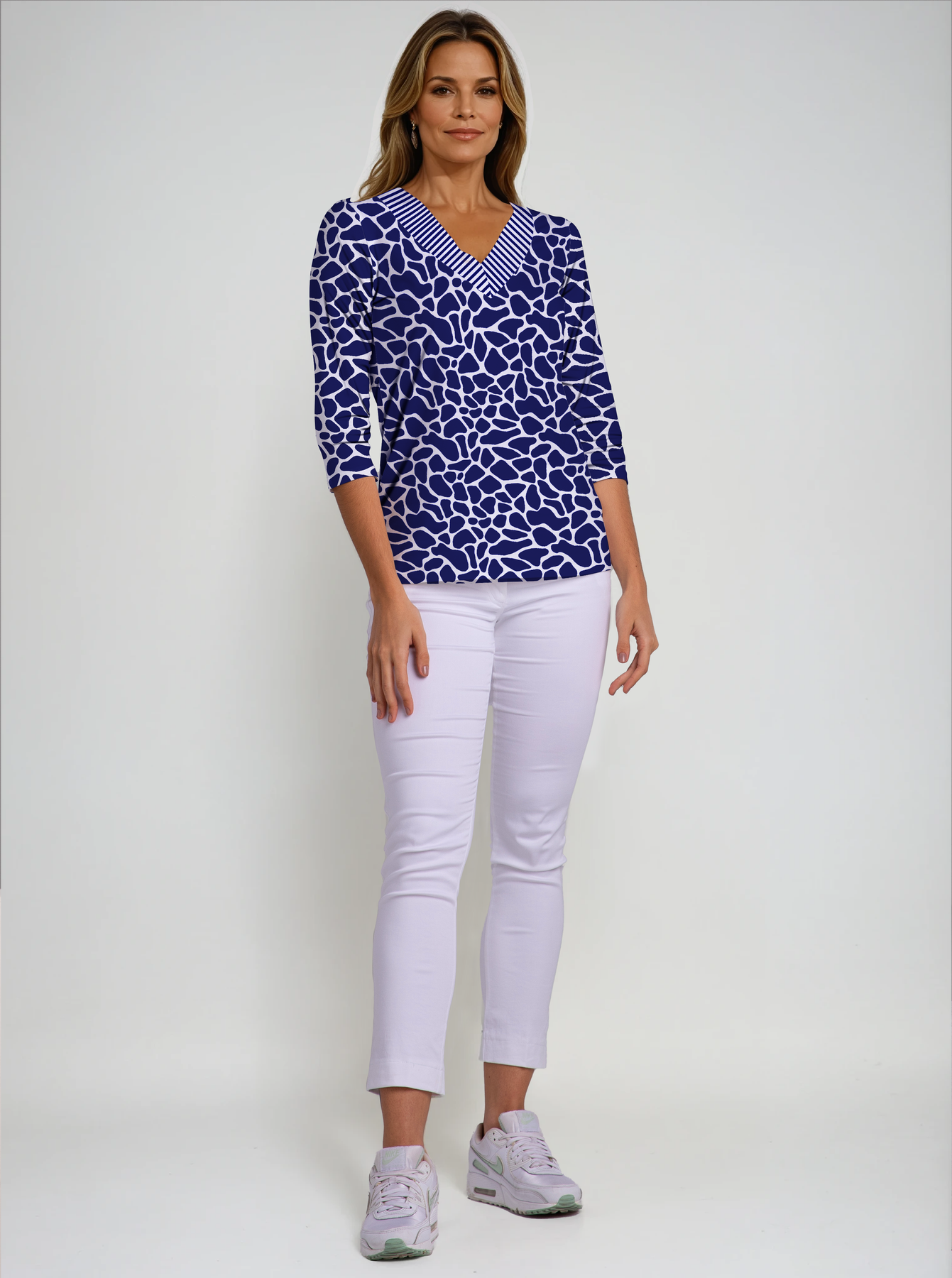 Giraffe skin Print Cotton Knit 3/4 Sleeve V-Neck Top