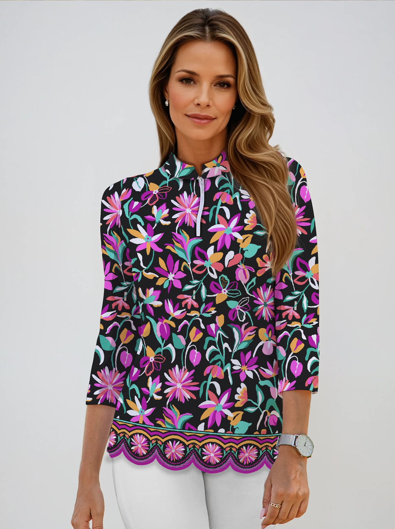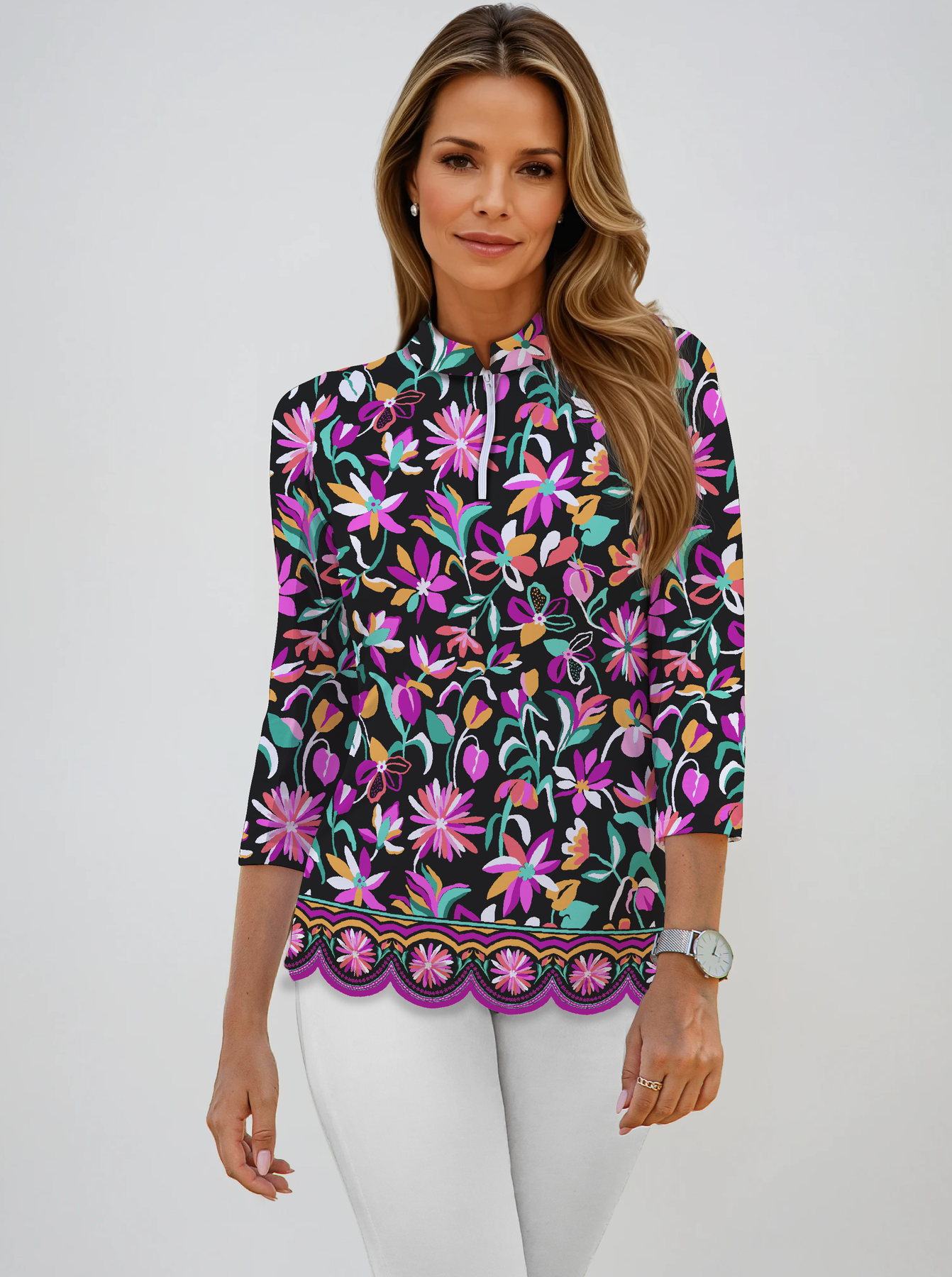Nylon Long Sleeve Zip Mock Neck Top WITH SCALLOP HEM