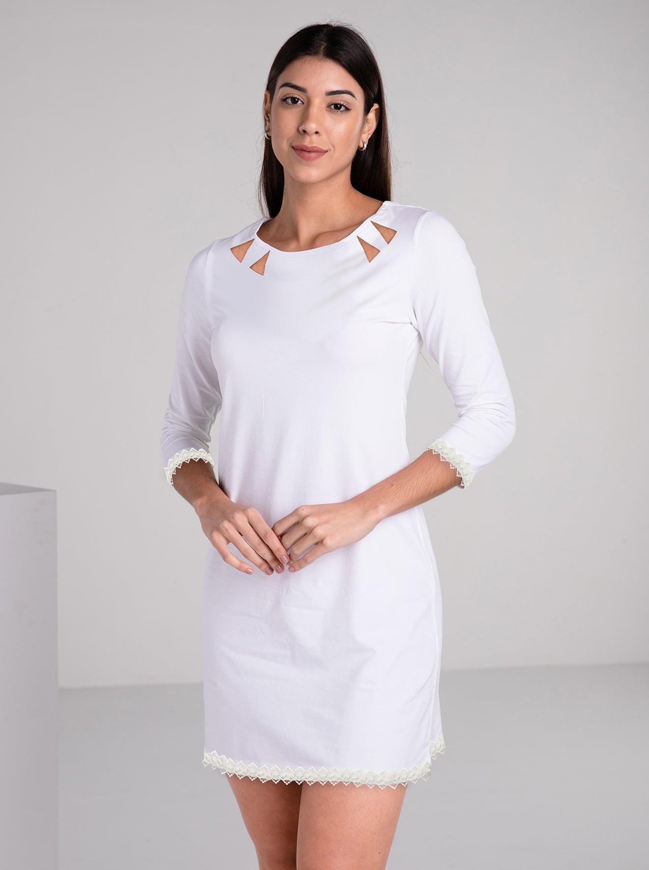 Solid Knit 3/4 Sleeve Crew Neck Embellished Dress - Rezobay